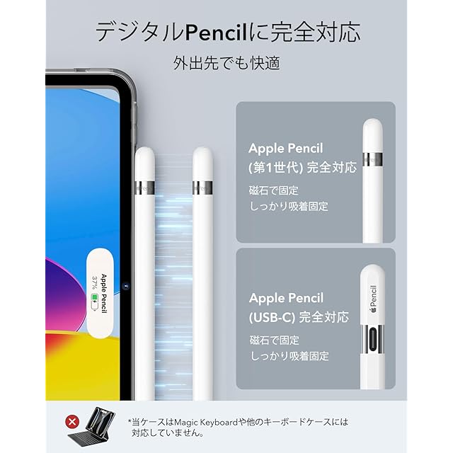 【Pencil 対応】:強力な磁気が内蔵されており、ペンシルをしっかりと吸着します。埋め込み式のサイドパネルにより充電も可能で、利便性が高いです