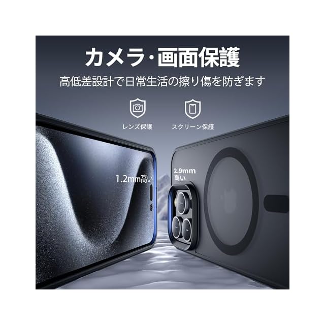 iphone 16 pro ケースの曲線に従って高低差を設計。液晶画面より1.2mm高く、カメラレンズより1.5mm高く、机などの平面に置いても傷付く心配はない。※本製品は6.3インチしか対応できないですから、ご購入する前サイズを確認ください。