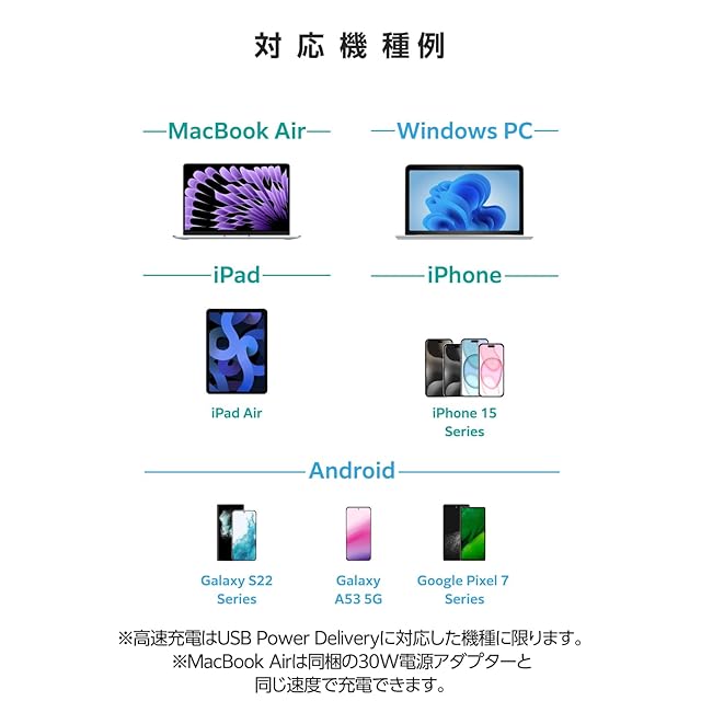 USB Power DeliveryおよびPPS規格に対応。機器に応じて電圧、電流が変化するため、スマートフォンやのタブレットはもちろん、Windowsノートパソコンまで幅広く充電できます。