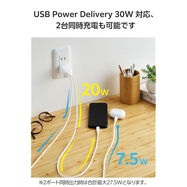 USB Type-C(TM)ポートを2ポート搭載し、Macbook Airなど対応するノートパソコン・スマートフォン・タブレットを充電できるAC充電器です。
