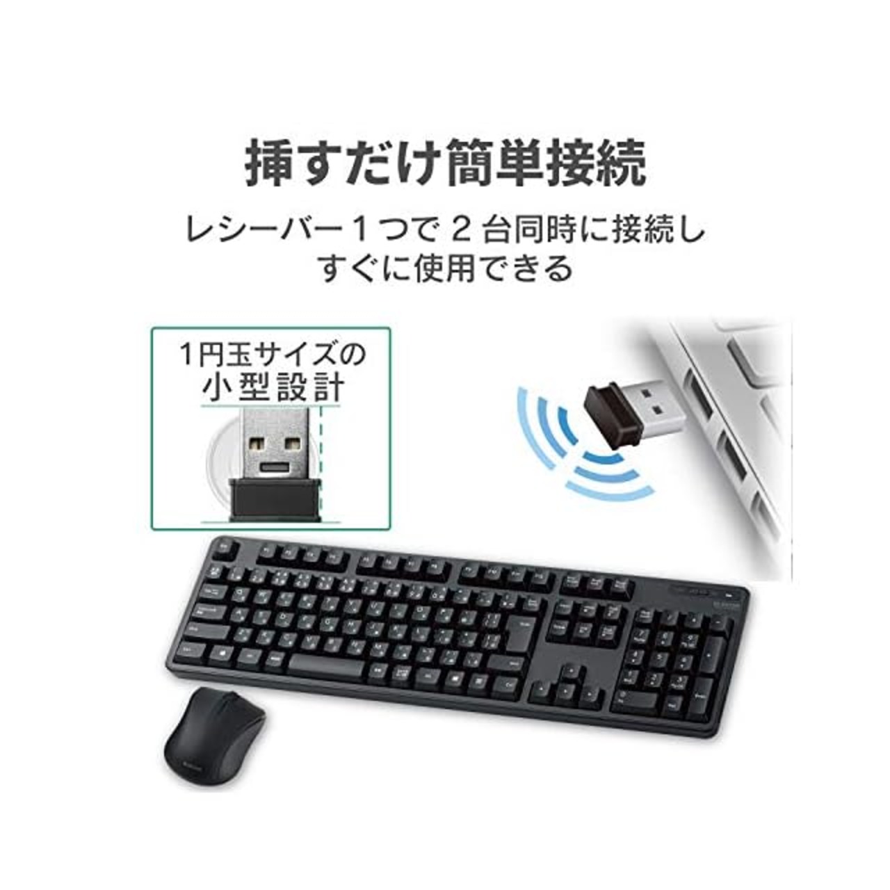1円玉サイズのマイクロレシーバーを採用しており、パソコンのUSBポートに挿すだけで、すぐに使用することができる無線接続タイプです。