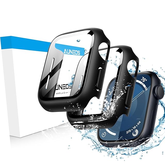 【360°防水ケース】AUNEOS Apple Watchケース serise 7/8/9 41mm専用保護カバー アップルウォッチ保護 PC+強化ガラス素材 一体型 新デザイン高透過率 硬度9H 耐衝撃 全面保護 超薄型 装着簡単(41mm、Black防水枠2個入り)