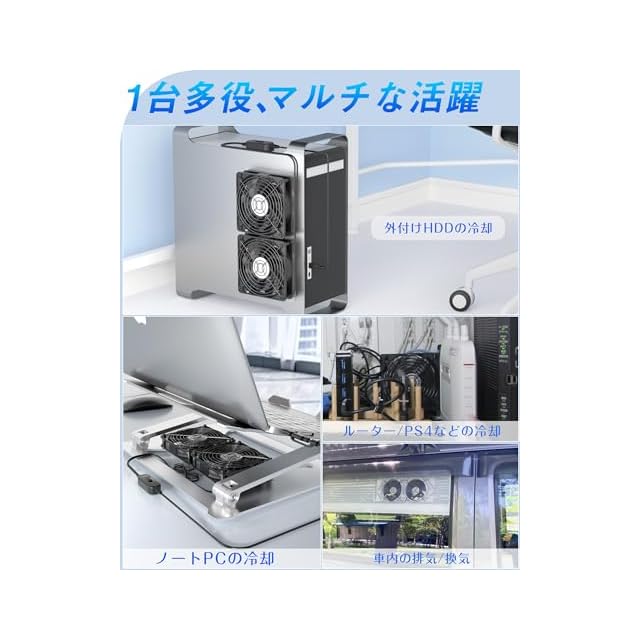 多様な用途に対応:外付けHDDやルーター、AV機器やスマート端末、PS4ゲーム機などの電子機器を冷やすために設計されており、熱暴走などによる故障や負荷を防ぎます。卓上扇風機としても、水槽、車中泊などの屋外活動時には排気や換気のためにご利用いただけ、様々なシーンで活躍します。