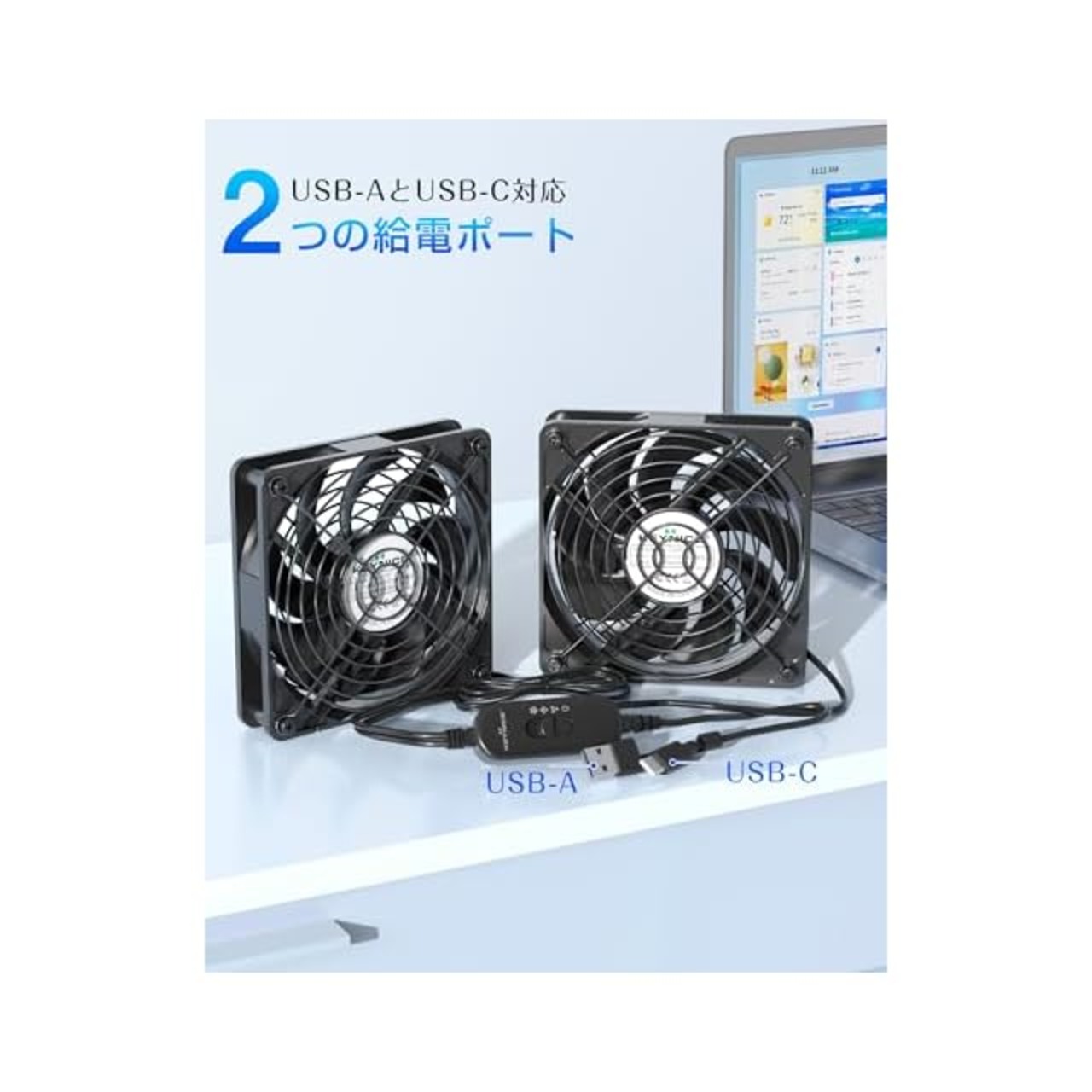 新型モデル:KN-1725P冷却ファンは、USB-AポートとUSB-Cポートの2つの電源供給ポートを備えており、複数のアダプターやPCなどの電源装置に広範囲に対応しています。2台のミニファンを自由な角度で設置が可能なため、冷却効果抜群です!