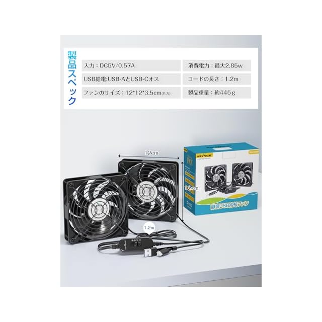 商品名:【進化モデル】Keynice 冷却ファン usbファン 扇風機 静音 強力2000RPM 小型 ミニ 車中泊 換気扇 冷却クーラー PC パソコン ルーター 水槽 PS4冷却 9枚羽根 12cm 2個1組 USB-Cポート対応 KN-1725P