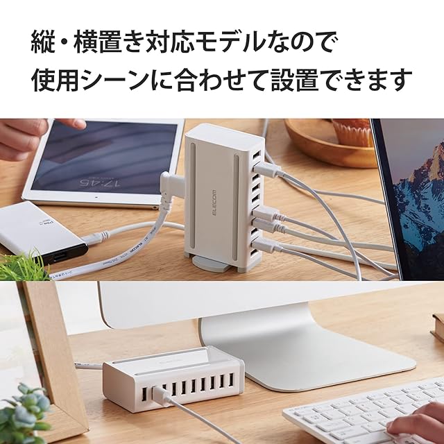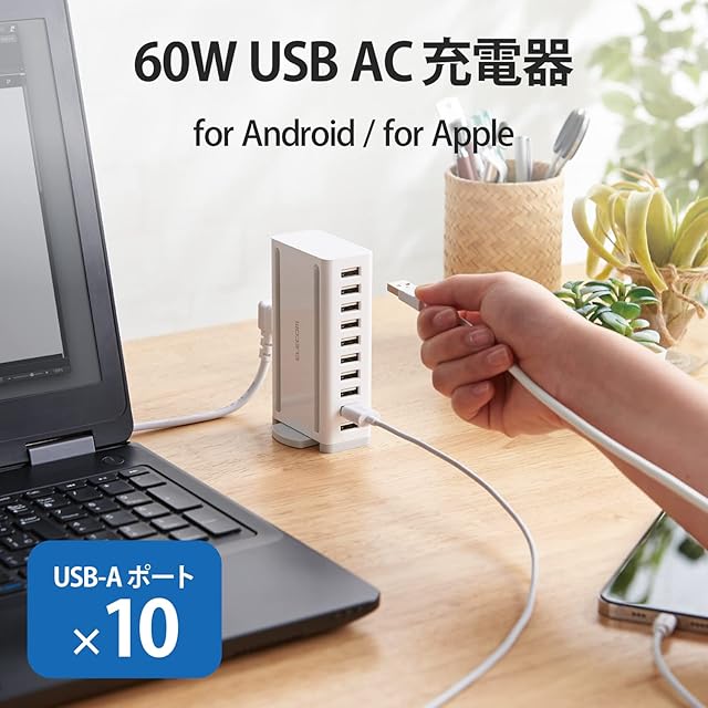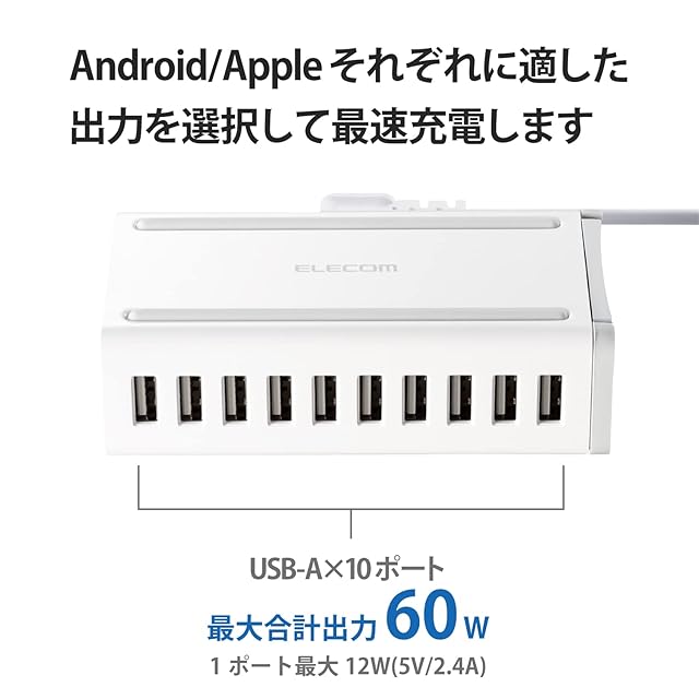 商品名:エレコム USB充電器 60W (合計最大出力) USB-A×10 【 iPhone15 / Android / 各種タブレット 対応 】 ACケーブル付属 1.5m EC-ACD04WH