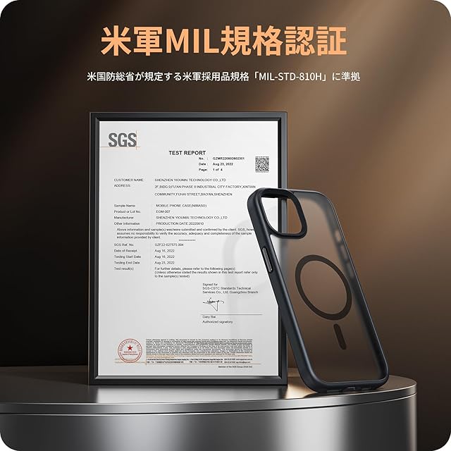 【米国MIL規格取得・耐衝撃】世界で有名な米国防総省が規定する米軍採用品規格「MIL-STD-810H」認証を取得済みです(認証番号:GZMR220802602301)。1.22mの高さからコンクリートの地面に厚さ5mmの合板を敷き、それぞれ違う角度から合計26回落下させても、本体は無傷です。高い耐衝撃性を誇り、スマホを全方位からしっかりと守ります。
