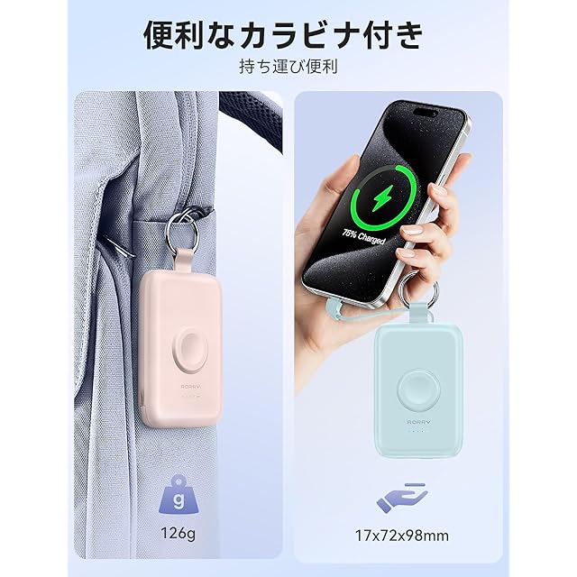 【apple watch全シリーズ対応 新色登場】RORRY モバイルバッテリー愛用者の皆様から、ファンだからこその声をたくさんいただく中で、「もっと色が選びたい」といった色に関するご要望をもとに、増色の開発を行ってきました。豊富な色揃えとスタイリッシュなデザインが、充電体験を向上します。Apple Watch用モバイルバッテリーは、ワイヤレス充電器が搭載され、外出先での不意なApple Watchバッテリーが切れて困った経験があるお方には理想的なパートナーです。また、[Type-cとiPhone用]2種類ケーブルが内蔵され、別途ケーブルの必要が無い、より快適に楽しんで充電することができます。Apple WatchやiPhone、Androidまで使っている、あらゆる端末のモバイルバッテリーとしてはこれで全部カバーできる、最適なソリューションです。