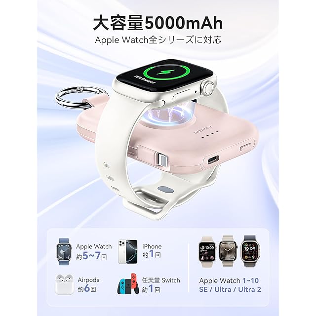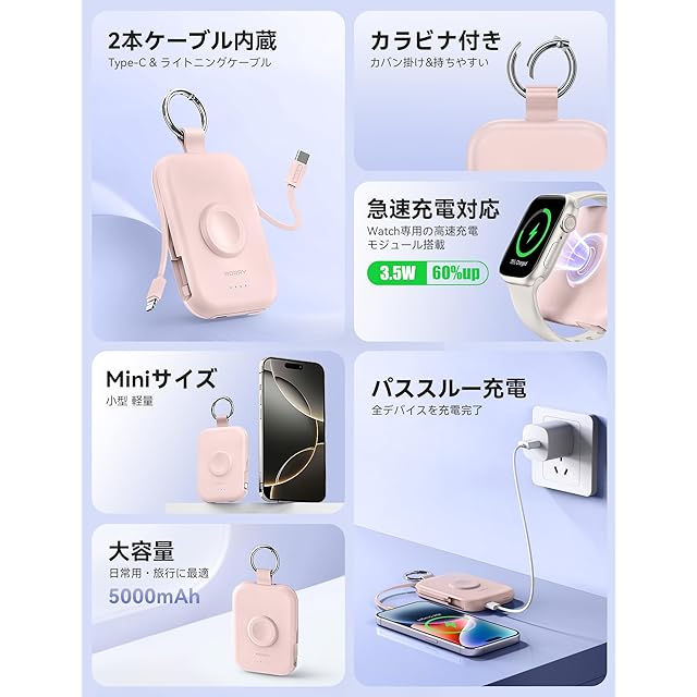商品名:【新色登場】RORRY apple watch 充電器 モバイルバッテリー 5000mAh 2本ケーブル内蔵 【iPhone用+Type-Cケーブル】 アップルウォッチ対応 ワイヤレス充電 同時充電 最大4台同時充電 For Apple Watch ultra2/9/8/7全シリーズに対応 軽量 小型 コンパクト 持ち運び/PSE認証済 for iPhone 15/14/Android ピンク