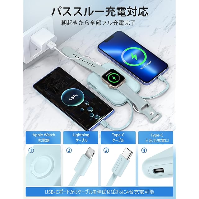 【2本ケーブル内蔵 & 4台同時充電可能】Type-CとiPhone用ケーブルが内蔵されており、USB-Cポートとapple watch 充電器を合わせて最大4台の機器を同時に充電することができ、パワーのある究極のモバイルバッテリーです。iPhone/Android/ゲーム機などデバイスに対応し、幅広い機種に対応できます。また、Type-C端子からモバイルバッテリー本体に蓄電できますし、パススルーにも対応しておりますので、モバイルバッテリーを充電しながらApple Watchなども充電できます。夜にセットして、朝起きたら全部フル充電完了です。