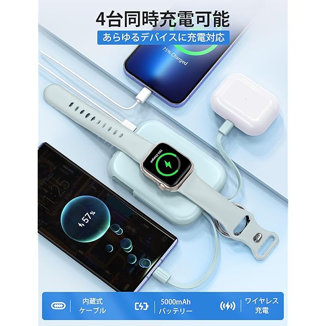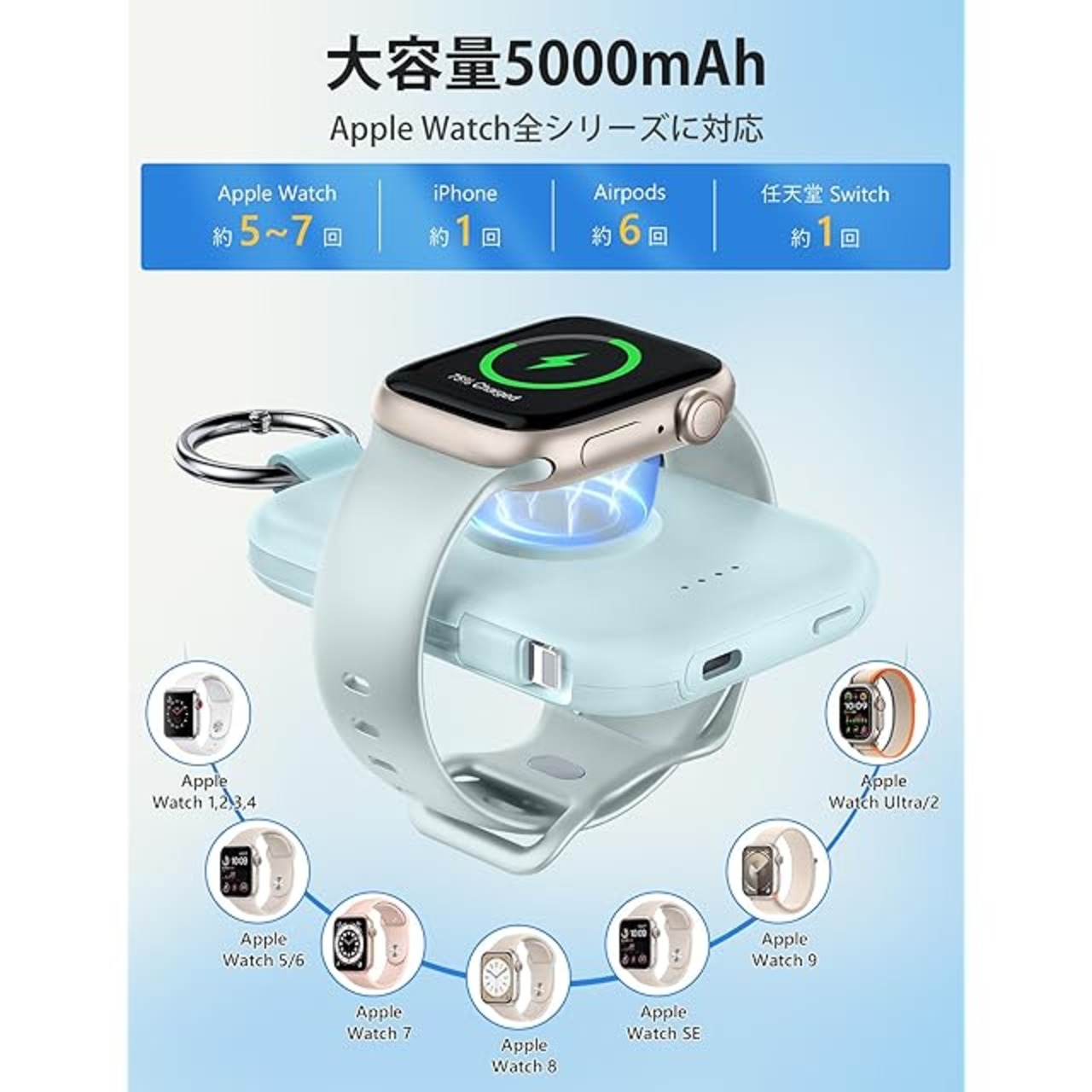 商品名:【新色登場】RORRY apple watch 充電器 モバイルバッテリー 5000mAh 2本ケーブル内蔵 【iPhone用+Type-Cケーブル】 アップルウォッチ対応 ワイヤレス充電 同時充電 最大4台同時充電 For Apple Watch ultra2/9/8/7全シリーズに対応 軽量 小型 コンパクト 持ち運び/PSE認証済 for iPhone 15/14/Android ブルー