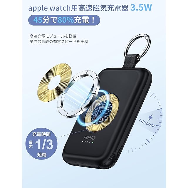 【For apple watch 本気的な高速磁気充電器に進化】RORRY進化版モバイルバッテリーはApple Watchに高速充電できるように改善しました。Apple Watch専用の高速充電モジュールを搭載され、45分程度でバッテリーの残量が0%から80%になります。つまり、容量倍増だけではなく、アップルウォッチへの充電スピードも大幅にupしました。まったく手間をかけずにApple Watchを急速充電できます。電池切れを心配なく、短い時間を活用して、Apple Watch電池が満タンの状態に回復できます。また、あっぷるうぉっち充電器は最新のosシステムに対応可能で、Watch OSがアップデートされてもご心配なく順調に充電できます。アップルウォッチ 急速充電を求めているお方には大変便利な充電器です。(高速充電に対応するのは、Apple Watch Series 10/9/8/7/Ultra/Ultra2のみです。)