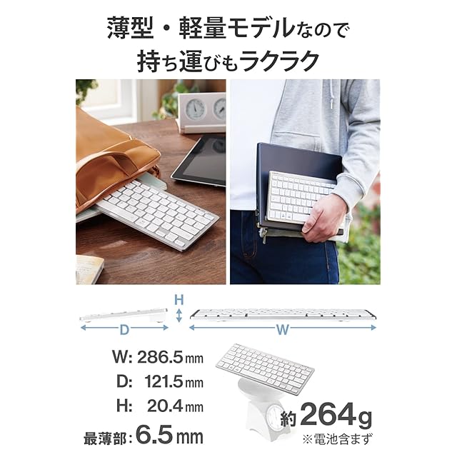 外形寸法(キーボード本体):幅286.5mm×奥行121.5mm×高さ20.4mm、質量(キーボード本体):約264g ※電池を含まず、キー配列:78キー(日本語配列) ※iOSのかな入力には対応していません。