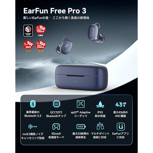 商品名:【VGP 2024金賞】EarFun Free Pro 3 ANC機能ワイヤレスイヤホン bluetooth/Snapdragon Sound対応/QCC3072チップ/aptX adaptive Bluetooth 5.3/ワイヤレス充電/6-マイクcVc8.0通話ノイズリダクション/マルチポイント接続/外音取り込みモード/専用アプリ/最大33時間再生/超軽量設計イヤホン(ネイビーブルー)