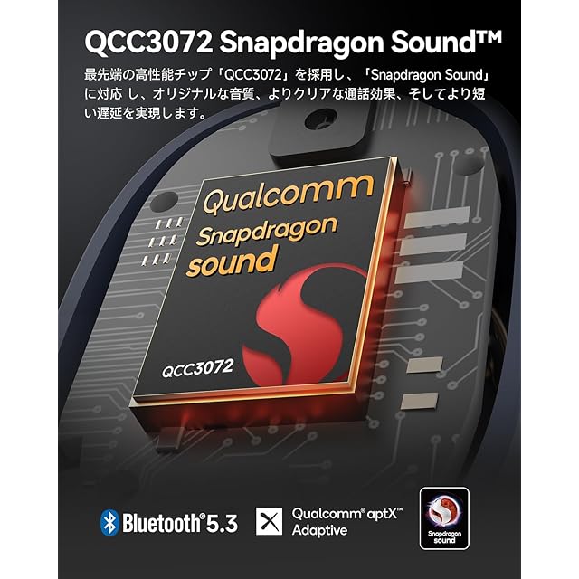 【Snapdragon Soundに対応、ワイヤレスでもハイレゾ音質の時代に】高性能チップ「QCC3072」を採用、最新のSnapdragon Sound音声技術に対応し最大伝送幅が2倍に向上、遅延も約45%低減しています。aptX adaptiveをサポート、最大24bit/96kHzのデータレートを実現しました。注意:Snapdragon Sound互換機器とのペアリングが必要です。