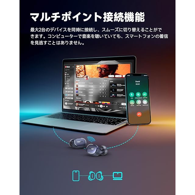 【マルチポイント接続対応、日常のニーズに応える】2つのデバイスをスマートに接続することで、パソコンで映画を見ている最中に、携帯電話がかかってきても、イヤホンで直ちに通話することができます。エンターテイメントと仕事を両立させましょう。【33時間のバッテリー持続時間】イヤホンは1回の充電で7.5時間以上の連続再生が可能であり(ANCオフ)、イヤホンは高速充電に対応しており、10分の充電で2時間の利用が可能です。充電ケースを含めた総合的なバッテリー持続時間は33時間に達し、音楽やゲームを一日中中断することなく楽しむことができます。それに加えて、イヤホンには便利なワイヤレス充電機能も備わっています。