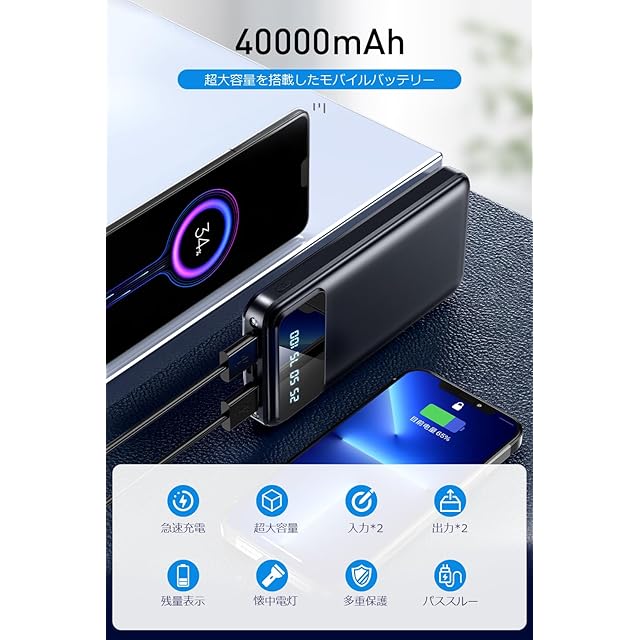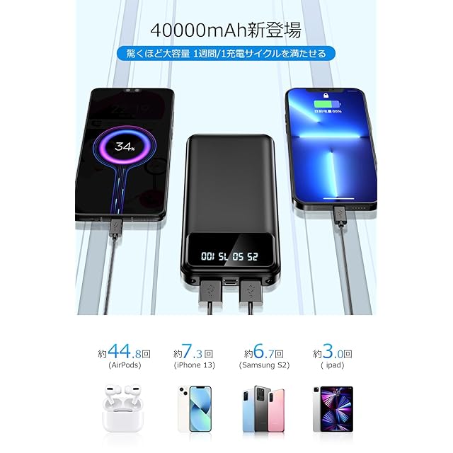 【超大容量バッテリー 長時間給電】40000mAh超大容量バッテリーを搭載し、スマホ、タブレットはもちろん、カメラ、ワイヤレスイヤホン、ゲーム機などほとんどのUSB機器に複数回充電可能な大容量モバイルバッテリーです。2.1A出力のスピード充電に対応、スマホの種類を問わずに充電可能、外出、アウトドア、旅行、出張、移動中など電源の取りにくい環境でバッテリー切れの心配がありません。