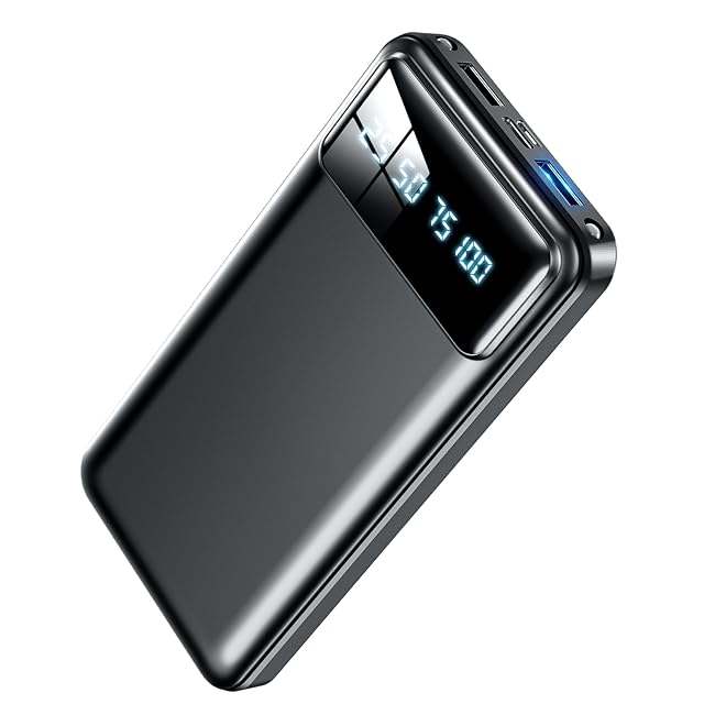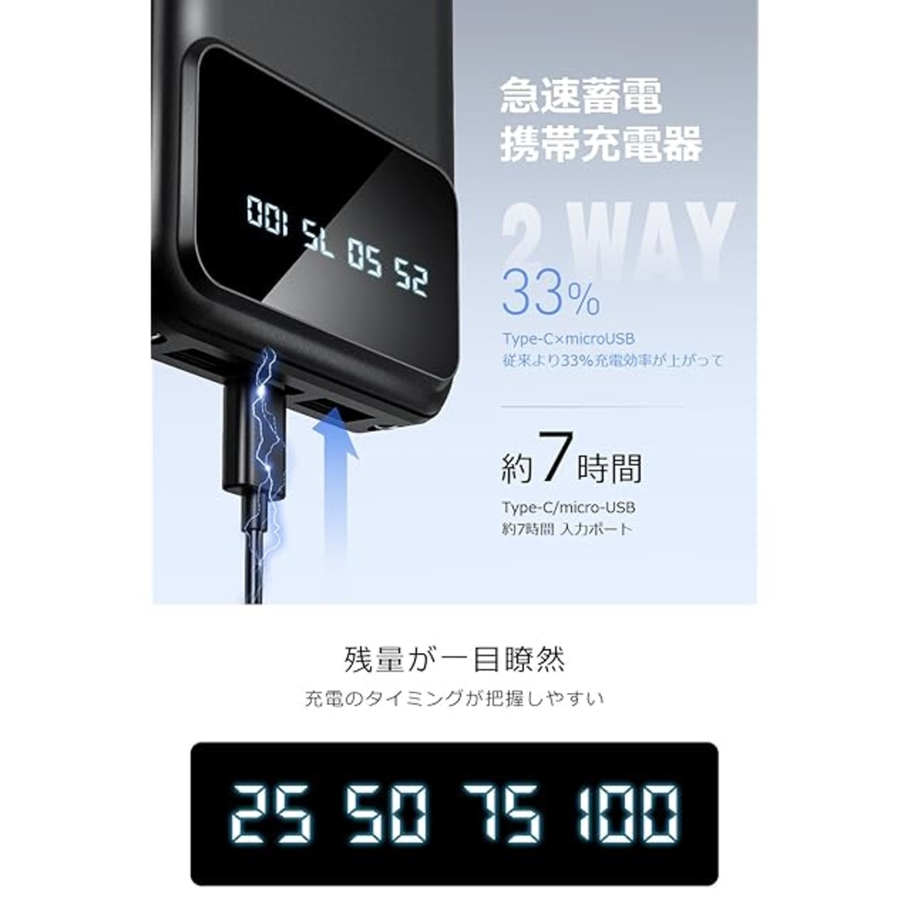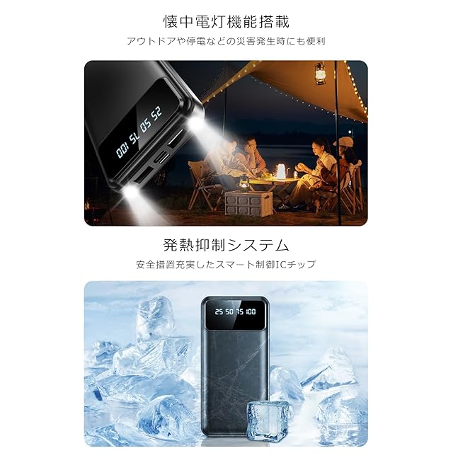 【LCD残量表示 LEDライト付き】LCDディスプレイにより、電源ボタンを1回押すと数字が光って表示され、モバイルバッテリーの残量が分かりやすく、充電のタイミングもより把握しやすいです。さらに、LED照明ライトが2個付き、ボタンを2回素早く押すとLEDライト点灯、夜間の外出、キャンプ、夜釣り、停電、災害など緊急時の非常用電源としても、懐中電灯代わりにも使え、暗闇を明るく照らしてくれます。