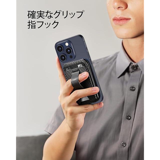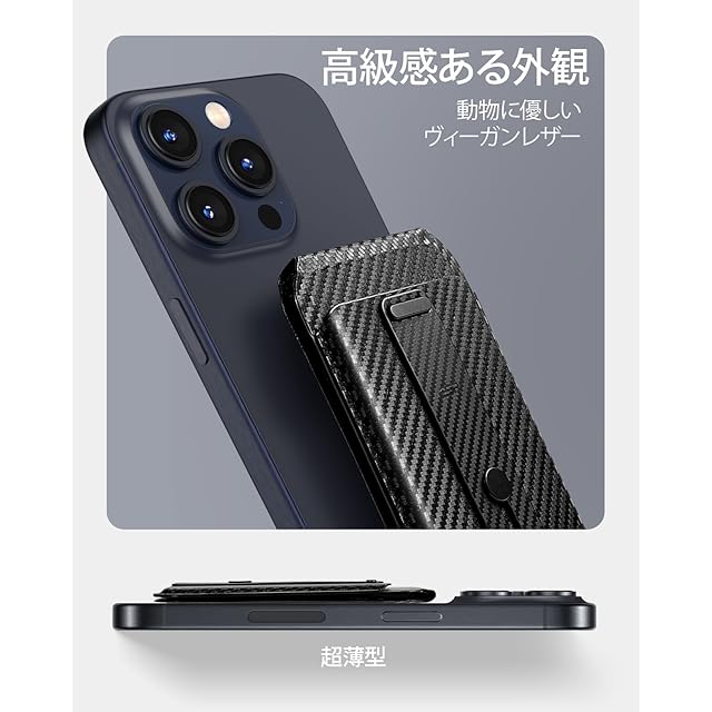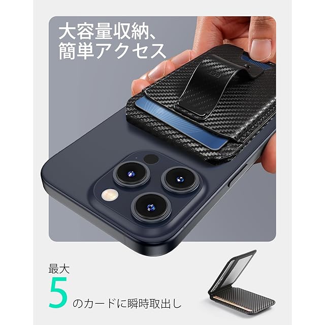 商品名:[ESR] 新登場 収納量アップ MagSafe カードケース 5枚カード収納 RFIDブロッキング ホルダー ス マホスタンド MagSafe対応ウォレット 調節可能なスタンド 財布 iPhone 16/15/14/13/12専用磁気ウォレット iPhone 13/12 mini非対応 ヴィーガンレザー Find My「探す」非対応 ブラックカーボンファイバー