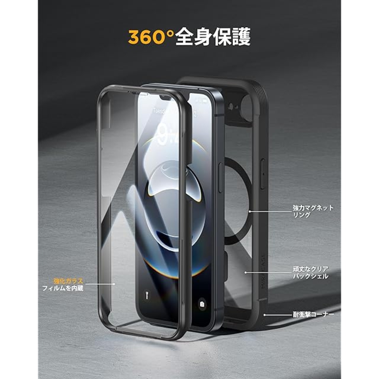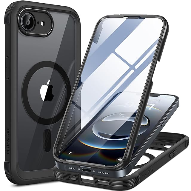 Miracase iPhone 16E ケース MagSafe対応 あいふおん16e スマホケース 2025 9H強化ガラス 6.1インチ フルカバー 360°全身保護 ワイヤレス充電対応 黒 | TREND DESIGN 家電専門店