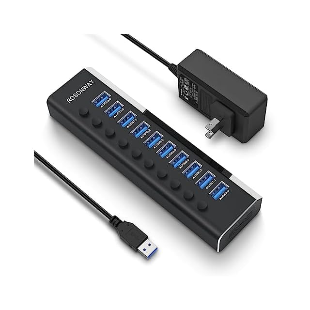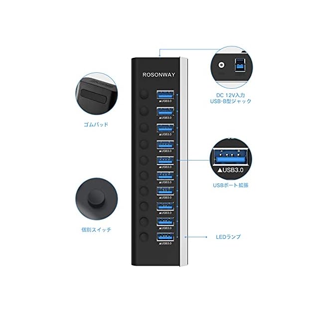 USB3.0ハブ 電源付き ROSONWAY 10ポート USBハブ アルミ製で アップ 5Gbps高速転送 セルフパワー USB拡張 独立スイッチ付 12V/3A ACアダプタ付き(RSH-A10) | TREND DESIGN 家電専門店