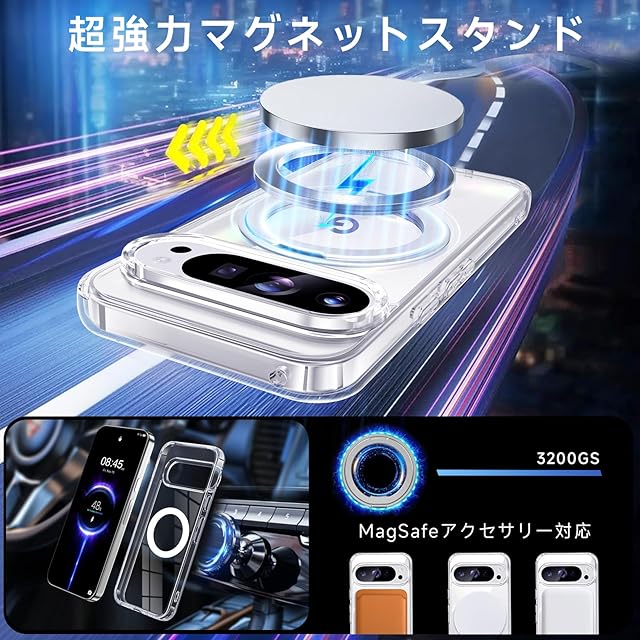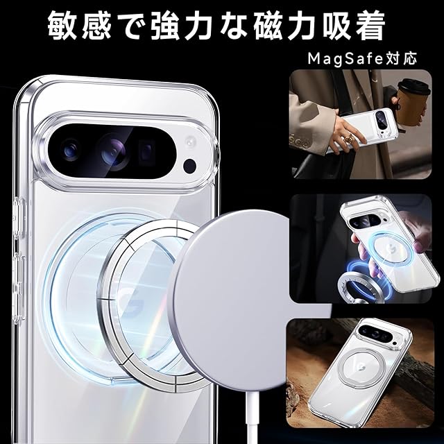 商品名:【米軍MIL規格・Magsafe対応】Google Pixel 9 / 9 Pro 用 ケース MagSafe対応 リング 360°回転スタンド機能 縦横両対応 透明 黄ばみ防止 ワイヤレス充電 レンズ保護 耐衝撃 携帯カバー グーグルピクセル9/9プロ カバー 6.3 インチ マグネット搭載 車載ホルダー マグセーフ対応 おしゃれ (クリア)