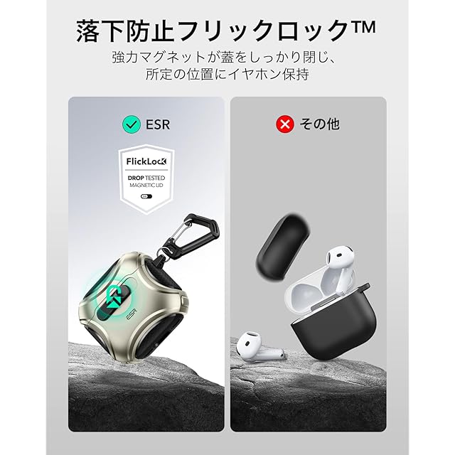 【安全なフリックロック】:フタの上部と底部に700gの保持力を持つ強力なマグネットと内部のラッチにより、AirPodsを中に安全にロックし、落としても飛び出すことはありません。
