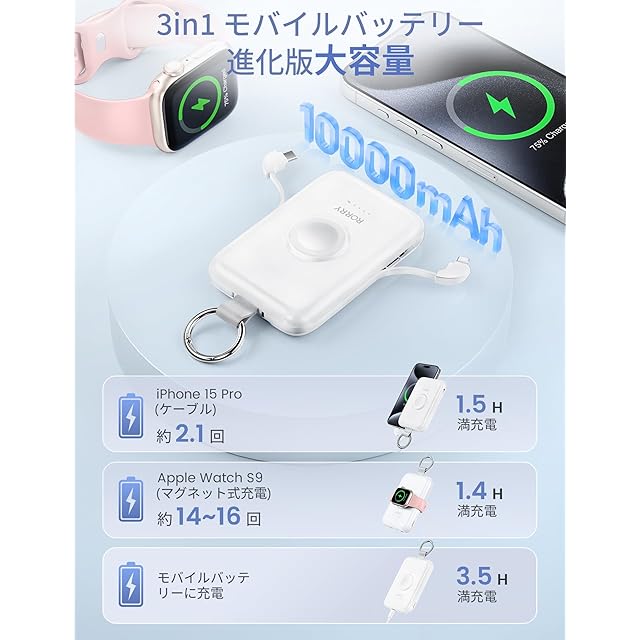 商品名:RORRY【進級プロ版 大容量】モバイルバッテリー 10000mAh ケーブル内蔵 アップルウォッチ 充電器 (20W USB-C&iPhone用ケーブル) 3in1 軽量 小型 4台同時 Type-C 急速充電 携帯充電器 For Apple Watch Ultra2/10/9/8/7/iPhone 16/15/14/iPad/AirPods 持ち運び 防災 (パープル)