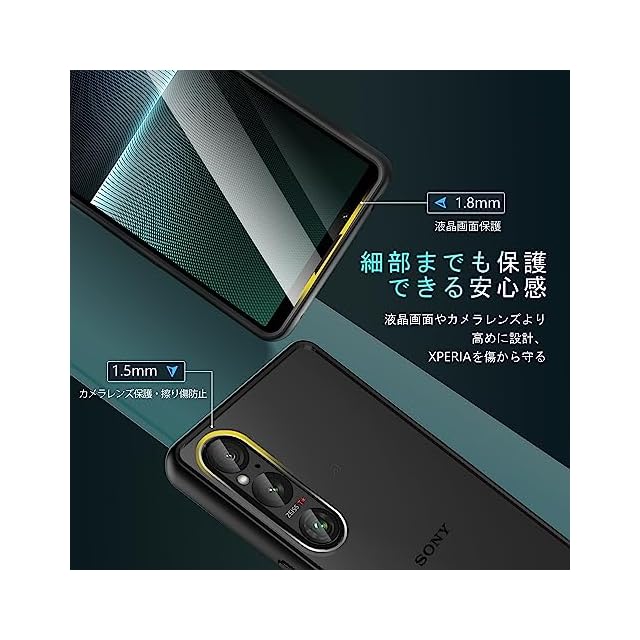 【液晶画面&カメラレンズ保護】本体の曲線に従って高低差設計があり、液晶画面より1.5mm高めで、端末を下向きに置いても机などの面に当たりません。フィルムを貼った状態でも画面より高さがあり、落としてしまった際でも画面は守られます。カメラレンズよりもケースのカメラ枠の方が出っ張っているので、気を使う事なくカメラ面を下にして本体を置く事が可能になりました。全方位からエクスペリア1Vをしっかりと守ります。