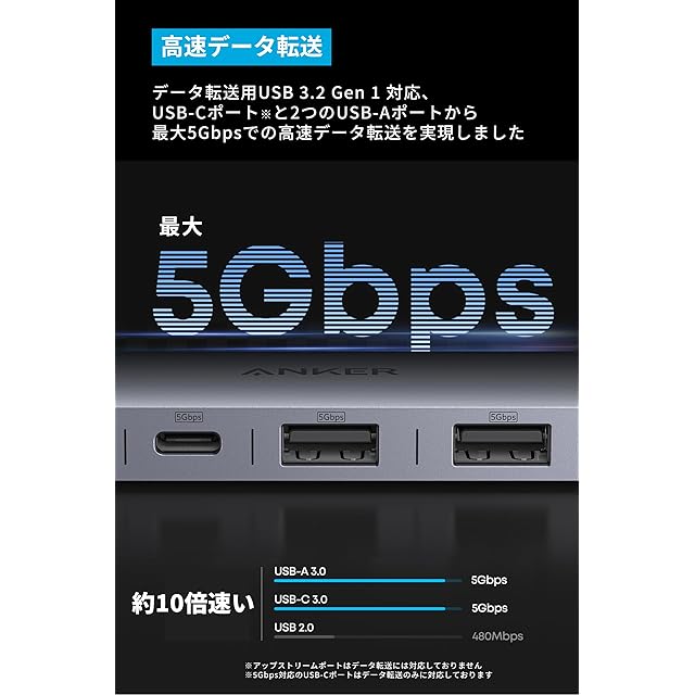 高速データ転送:データ転送用USB 3.2 Gen 1対応のUSB-Cポートと2つのUSB-Aポートから最大5Gbpsでの高速データ転送を実現し、即座に同期することが可能です。