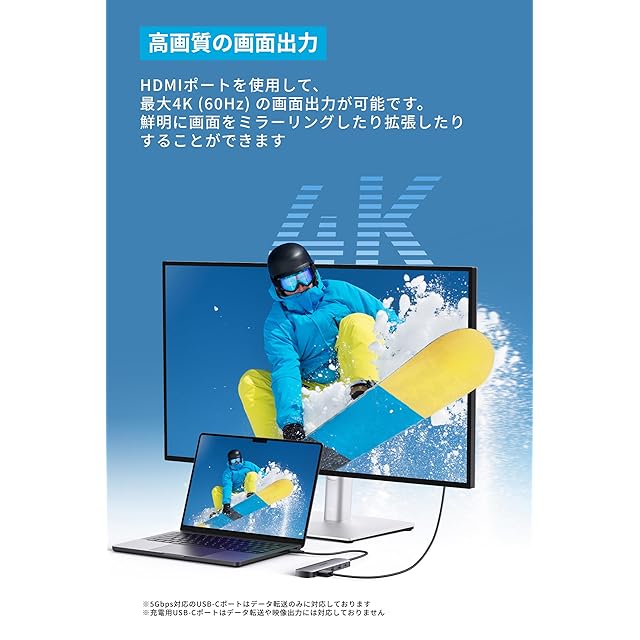 高画質の画面出力:HDMIポートを使用して、最大4K (60Hz) の画面出力が可能です。鮮明に画面をミラーリングしたり拡張したりすることができます。