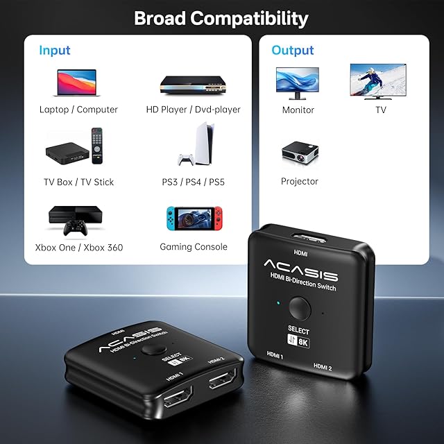 ACASIS HDMI 切り替え器 分配器 8K 60Hz, HDMI セレクター 2入力1出力 双方向 HDCP, 手動 電源不要 PC Xbox PS4 Fire TV Stick Apple TVに対応