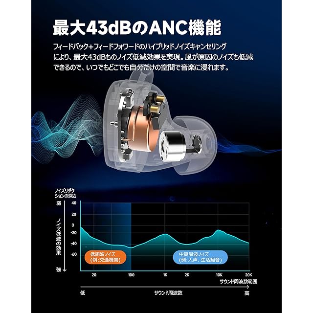 【43dbのディープアクティブノイズキャンセリング、いつでも音楽を静かに楽しむ】フィードフォワード+フィードバックのハイブリッドアクティブノイズキャンセリングにより、最大43dBまでノイズを低減します。騒々しい屋外環境や混雑したバスや電車でも、ノイズキャンセリングモードをワンタッチでオンにして、いつでもどこでも静かな世界を手に入れましょう。周囲の会話を自由に聞きながら音楽を楽しむために環境音モードもサポートされています。✅【イヤーフックデザイン】パッケージには4つの異なるサイズのイヤーチップとイヤーフックが付属しています。最適なノイズキャンセリング効果を得るために、自分に最適なイヤーチップとイヤーフックを選び、耳に密着させてください。