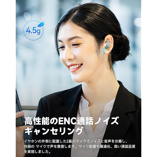 【6つのマイクによるCVC通話ノイズキャンセリング、クリアな通話品質】各イヤホンにはフィードフォワード、フィードバック、通話用の3つのマイクアレイが内蔵されており、CVCノイズキャンセリングアルゴリズムと組み合わせることで、ノイズを除去し、クリアな人の声を保ちます。騒々しい環境でも、周囲のノイズと人の声を正確に分離して、クリアな通話が可能です。【Bluetooth 5.3の安定した転送】次世代の高通Bluetooth 5.3チップは、転送アルゴリズムを最適化し、転送性能と接続の安定性が向上しました。