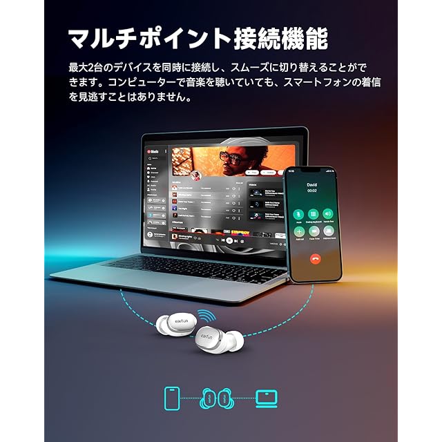 【マルチポイント接続対応、日常のニーズに応える】2つのデバイスをスマートに接続することで、パソコンで映画を見ている最中に、携帯電話がかかってきても、イヤホンで直ちに通話することができます。エンターテイメントと仕事を両立させましょう。【33時間のバッテリー持続時間】イヤホンは1回の充電で7.5時間以上の連続再生が可能であり(ANCオフ)、イヤホンは高速充電に対応しており、10分の充電で2時間の利用が可能です。充電ケースを含めた総合的なバッテリー持続時間は33時間に達し、音楽やゲームを一日中中断することなく楽しむことができます。それに加えて、イヤホンには便利なワイヤレス充電機能も備わっています。