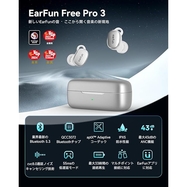 商品名:【VGP 2024金賞】EarFun Free Pro 3 ANC機能ワイヤレスイヤホン bluetooth/Snapdragon Sound対応/QCC3072チップ/aptX adaptive Bluetooth 5.3/ワイヤレス充電/6-マイクcVc8.0通話ノイズリダクション/マルチポイント接続/外音取り込みモード/専用アプリ/最大33時間再生/超軽量設計イヤホン(シルバーホワイト)