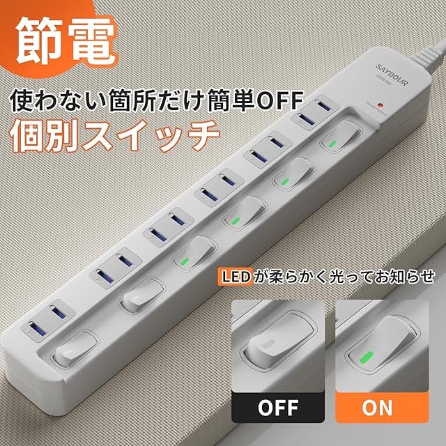 商品名:SAYBOUR 電源タップ 雷ガード 個別スイッチ 節電タップ おしゃれ省エネACコンセント 6個口LED PSE認証済 延長コード (3m, ホワイト)