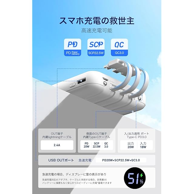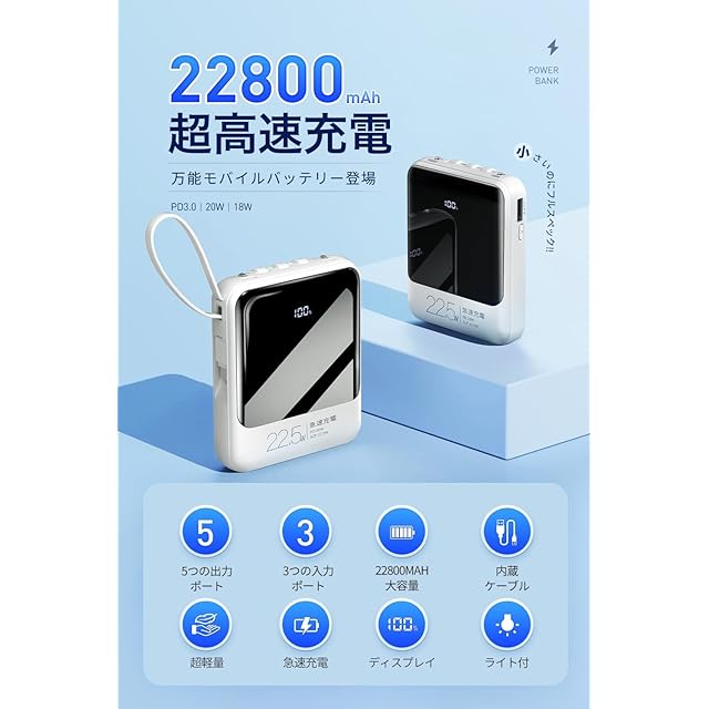 商品名:モバイルバッテリー 小型 【大容量22800mAh 22.5W/20W急速充電】 4本ケーブル内蔵 5台同時に充電 超軽量210g 携帯バッテリー スマホ 充電器 LED残量表示 Type-C入出力ポート搭載 ストラップ付き 持ち運び便利 LEDライト付き 携帯充電器 PSE技術認証済 旅行/出張/アウトドア/停電/緊急/防災用 機内持ち込み可 iOS/Android各種他対応 (ホワイト)