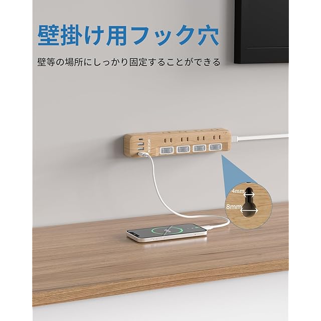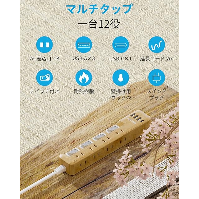 Mscienエムサイン 延長コード 2m 電源タップ usb付き 雷ガード 8AC口 3usb-a 1usb-c マルチタップ スイッチ たこあしコンセント 分岐 oa テーブルタップ スイングプラグ 壁掛け 木目調 蛸足コンセント | TREND DESIGN 家電専門店