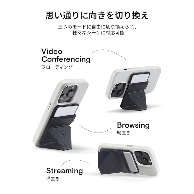 【三つの使用モード・自由に切り換え】マグネット内蔵で、MagSafe対応機種(iPhone16/15 /14/13/12シリーズ)にお使いいただけます。縦置き、横置き、フローティングモードに自由に切り換えられ、様々なシーンに対応可能です。