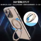 【360°回転スタンド · 縦も横も思いのまま】多機能スタンドとリング一体型の斬新なデザインです。ケースを閉じれば背面はスマートに平坦に。縦置きでも横置きでも安定して支えられ、0°~ 120°の間で多角度自由に調整できます。ケースを開けるだけでスタンドの完成!指にかければリングも便利に使用でき!また、安定したアルミ合金製の円形スタンドを採用しており、携帯性からもファッション性からも唯一無二の存在です。