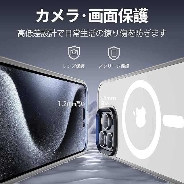 アイホン16 Proの曲線に従って高低差を設計。液晶画面より1.2mm高く、カメラレンズより1.5mm高く、机などの平面に置いても傷付く心配はない。※本製品は6.3インチしか対応できないですから、ご購入する前サイズを確認ください。