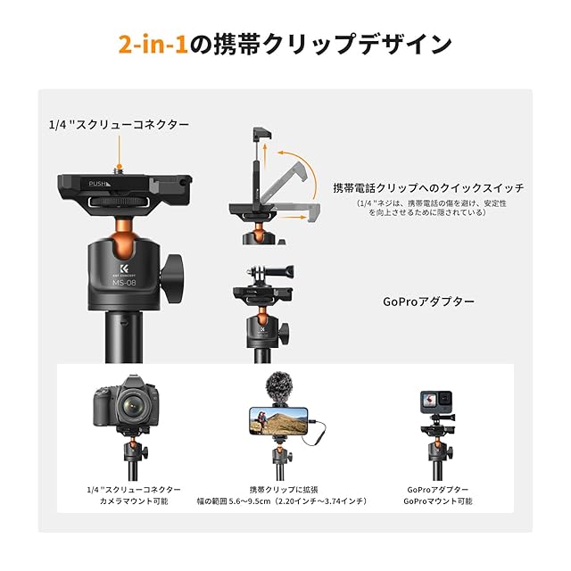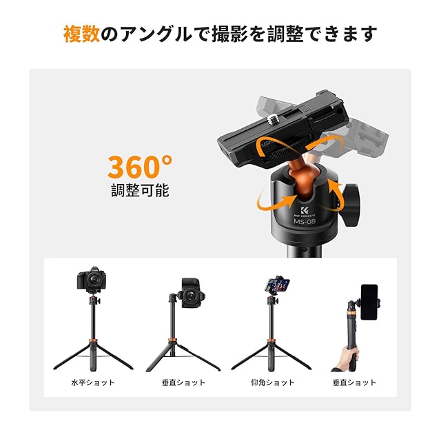スマホカメラ三脚K&F Concept 自撮り棒 7段伸縮 最大高さ159cm コールドシュー付き 卓上スタンド 360度回転 自由雲台 1/4ネジ穴 持ち運び便利 vlog ビデオカメラ GoProに対応 セルカ棒 | TREND DESIGN 家電専門店