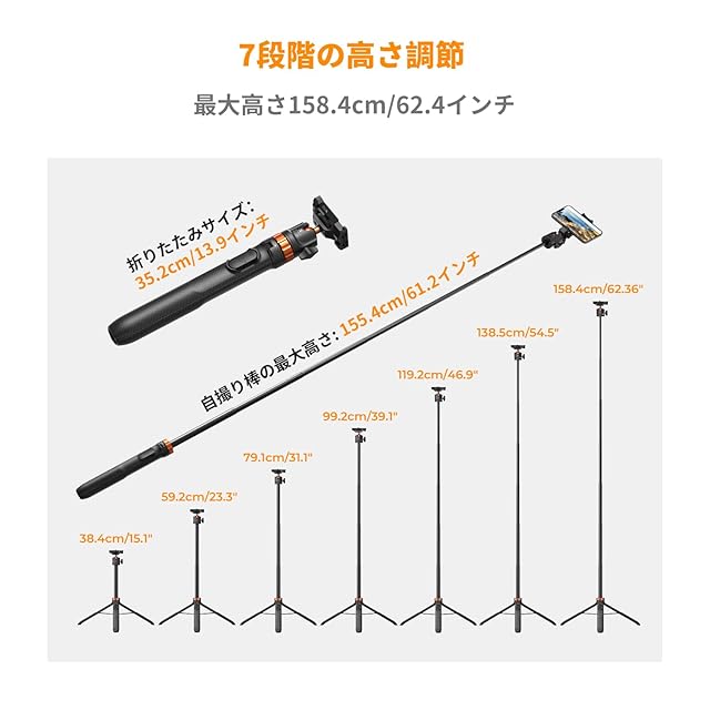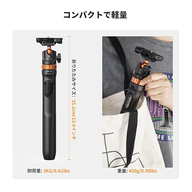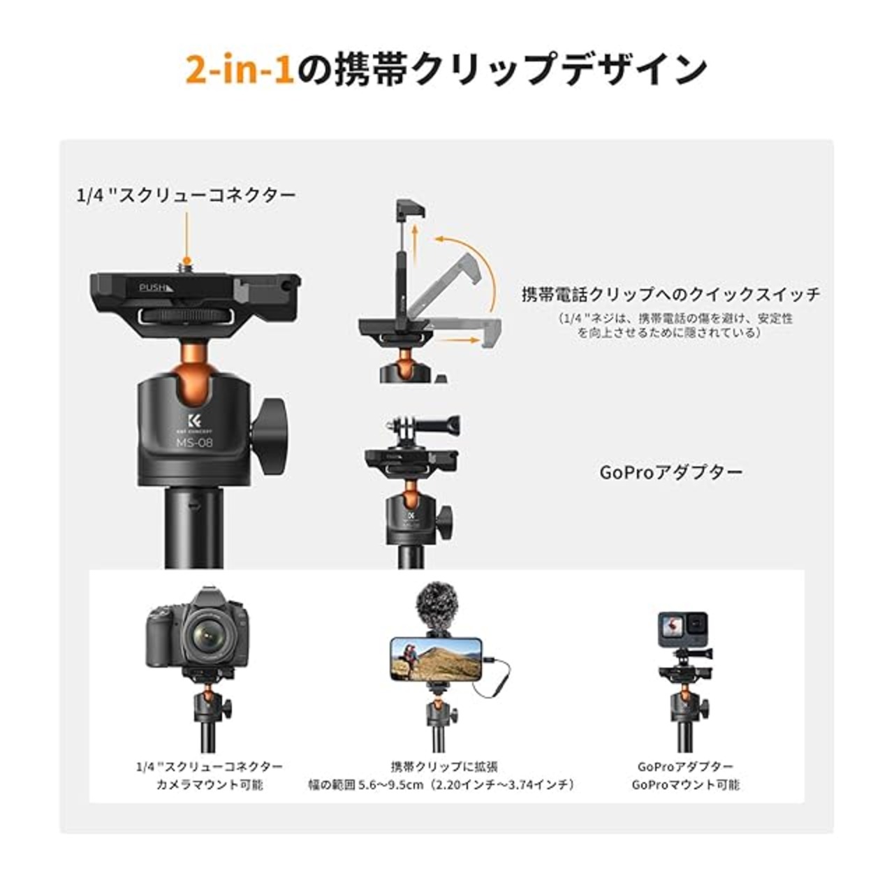 商品名:スマホカメラ三脚K&F Concept 自撮り棒 7段伸縮 最大高さ159cm コールドシュー付き 卓上スタンド 360度回転 自由雲台 1/4ネジ穴 持ち運び便利 vlog ビデオカメラ GoProに対応 セルカ棒