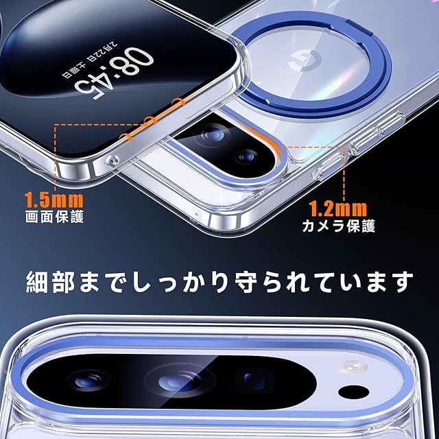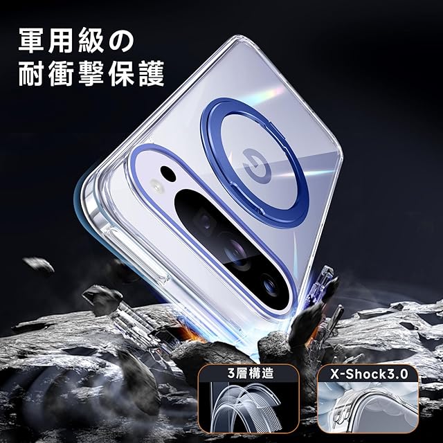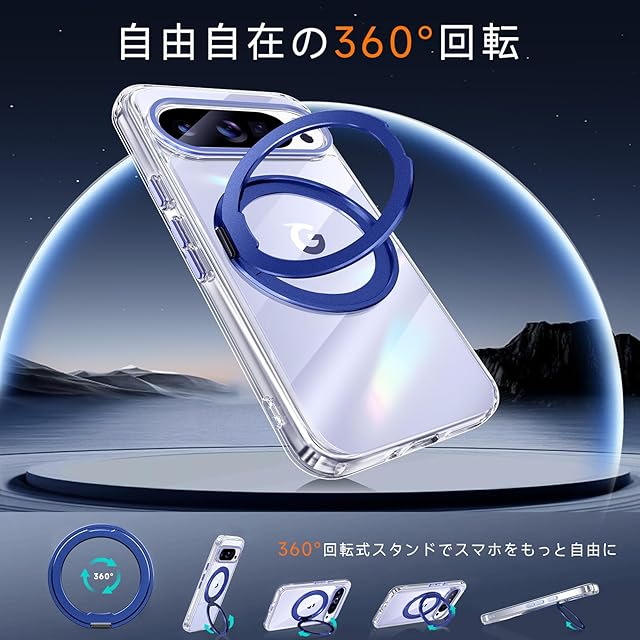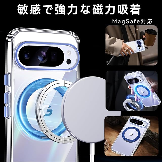 商品名:【米軍MIL規格・Magsafe対応】Google Pixel 9 / 9 Pro 用 ケース MagSafe対応 リング 360°回転スタンド機能 縦横両対応 透明 黄ばみ防止 ワイヤレス充電 レンズ保護 耐衝撃 携帯カバー グーグルピクセル9/9プロ カバー 6.3 インチ マグネット搭載 車載ホルダー マグセーフ対応 おしゃれ (クリアブルー)