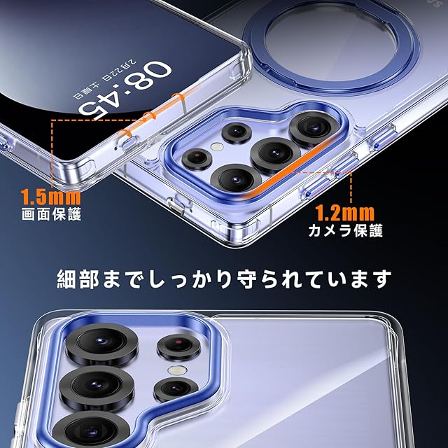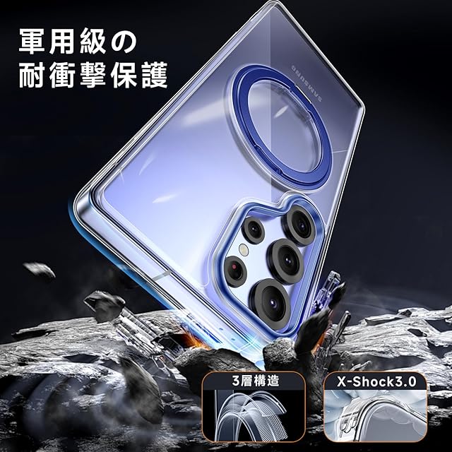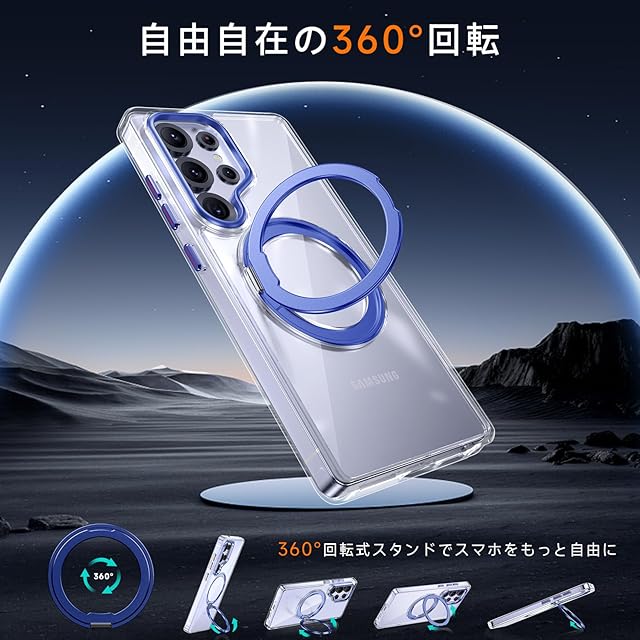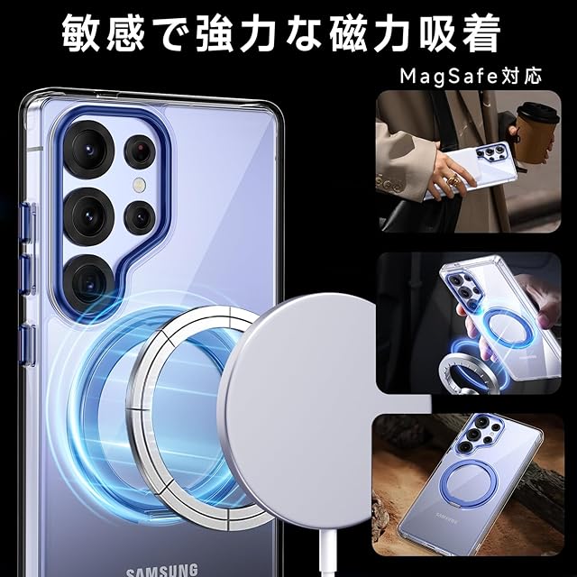商品名:【米軍MIL規格・Magsafe対応】Galaxy S25 Ultra 用 ケース MagSafe対応 リング 360°回転スタンド機能 縦横両対応 透明 黄ばみ防止 ワイヤレス充電 レンズ保護 耐衝撃 携帯カバー ギャラクシーS25 ウルトラ カバー マグネット搭載 車載ホルダー マグセーフ対応 おしゃれ (クリアブルー)