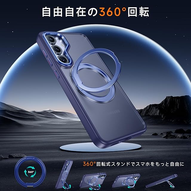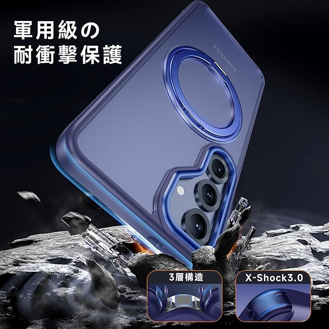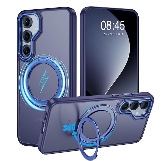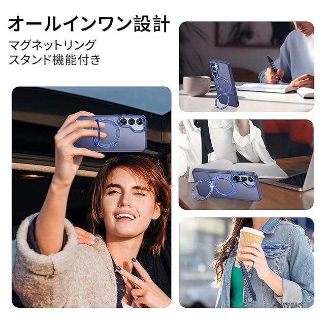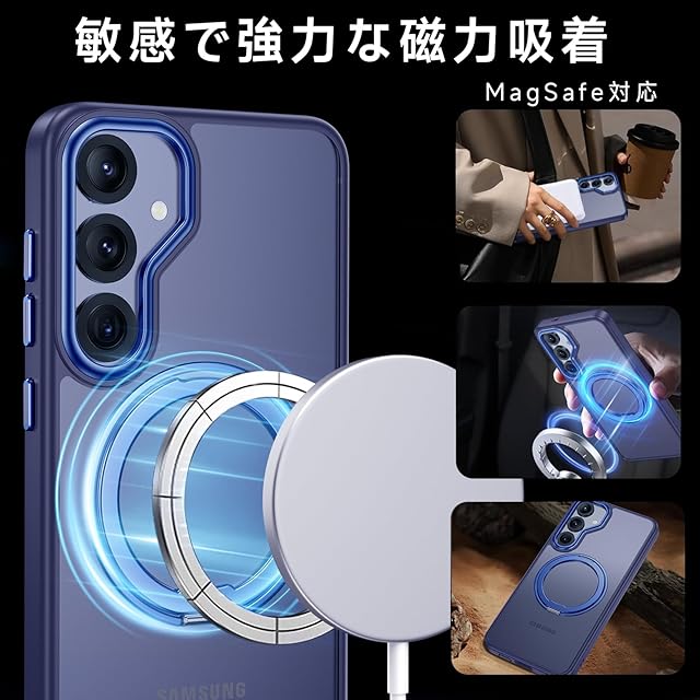 商品名:【米軍MIL規格・Magsafe対応】Galaxy S25 用 ケース MagSafe対応 リング 360°回転スタンド機能 縦横両対応 半透明 黄ばみ防止 ワイヤレス充電 レンズ保護 耐衝撃 携帯カバー ギャラクシー S25 カバー マグネット搭載 車載ホルダー マグセーフ対応 おしゃれ (ブルー)