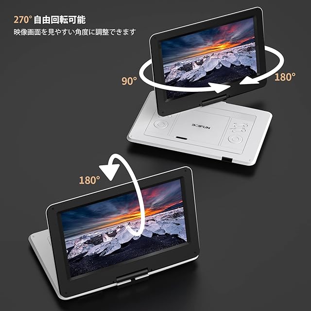 【高画質&大画面鑑賞・270°自由回転】1366*768 低消費電力LED液晶パネルを採用し、より高精細な画質を提供できます。2024最新型の14.1インチの大画面で可視画面が大きくなり、余暇な時にDVD映画を思う存分楽しめます。このポータブルDVDプレーヤーは左右 270°を好きな角度に自由回転、上下180° 反転させて折りたたむとディスプレイとして見ることができ、子どもを連れてのドライブ旅行にも最適です!