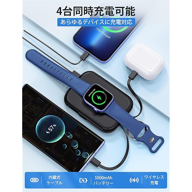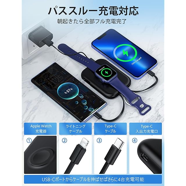 【2本ケーブル内蔵 & 4台同時充電可能】Type-CとiPhone用ケーブルが内蔵されており、USB-Cポートとapple watch 充電器を合わせて最大4台の機器を同時に充電することができ、パワーのある究極のモバイルバッテリーです。iPhone/Android/ゲーム機などデバイスに対応し、幅広い機種に対応できます。また、Type-C端子からモバイルバッテリー本体に蓄電できますし、パススルーにも対応しておりますので、モバイルバッテリーを充電しながらApple Watchなども充電できます。夜にセットして、朝起きたら全部フル充電完了です。