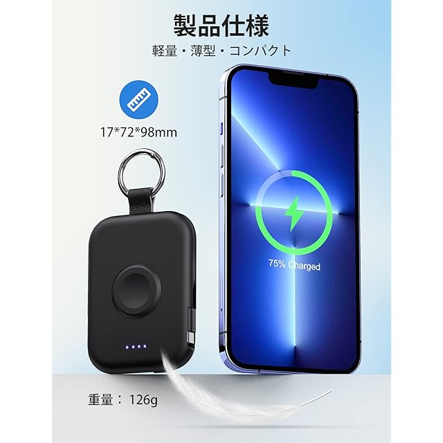 【5000mAhバッテリー/磁気充電】5000mAh容量バッテリーが内蔵され、Apple Watchを7回フル充電することができます。iphone16を約1回、一日中の充電対策としては十分です。そして、Apple Watch充電器はコンセントやケーブルがなくてもくっつけるだけで充電できます。磁気ワイヤレス充電モードなので、置くだけで、しっかりと吸着させ、いつでもどこでも充電することが可能になります。また、133gという軽さ、コンパクトさと汎用性のバランスが取れている一品です。